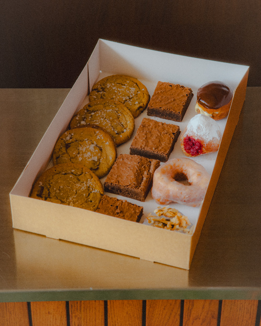 A mixed pastry box including 4 brownies, 4 cookies and 4 donuts, perfect for sharing. Use the dropdown to choose your donuts and cookies.